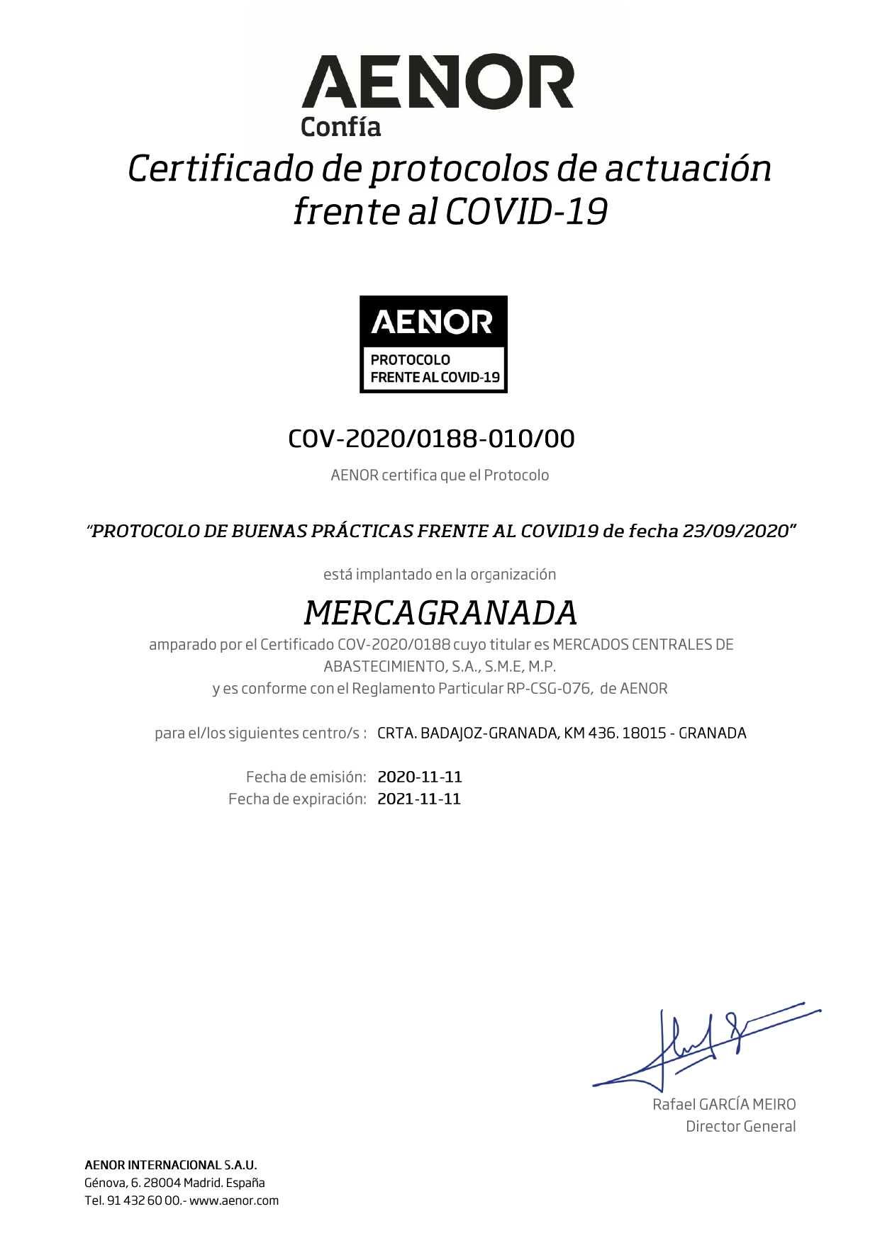 El certificado de AENOR acredita la efectividad de las medidas puestas en marcha por Mercasa desde el inicio de la crisis sanitaria y el cumplimiento de las directrices marcadas por el Ministerio de Sanidad.Entre ellas se encuentran la gestión de riesgos y de la salud en el trabajo; la formación, información y comunicación desarrolladas; las medidas tanto organizativas como de protección puestas en marcha (distancia mínima, control de aforo, uso individual de equipamiento y material, etc.) y las buenas prácticas en limpieza e higiene, entre otros.